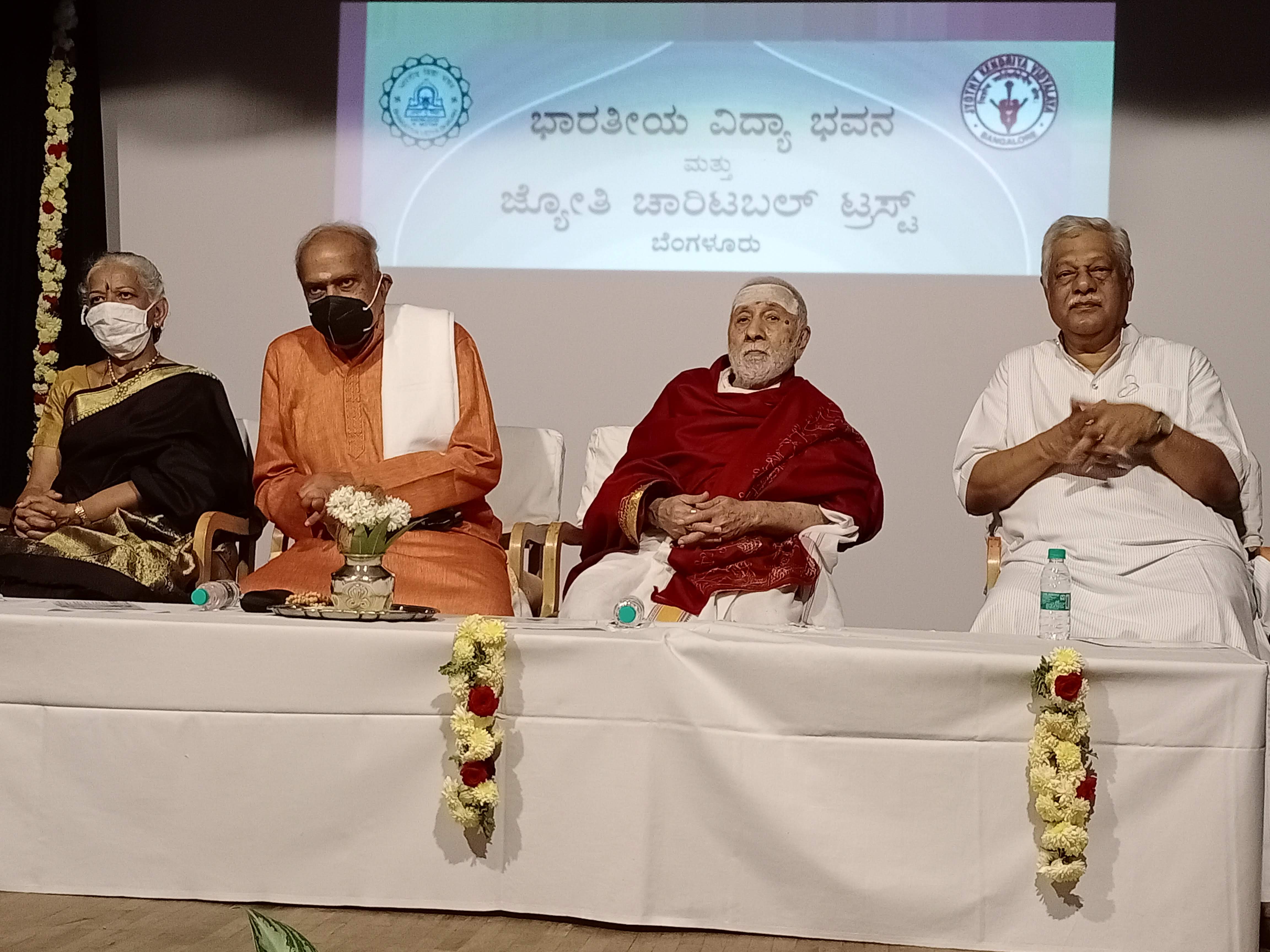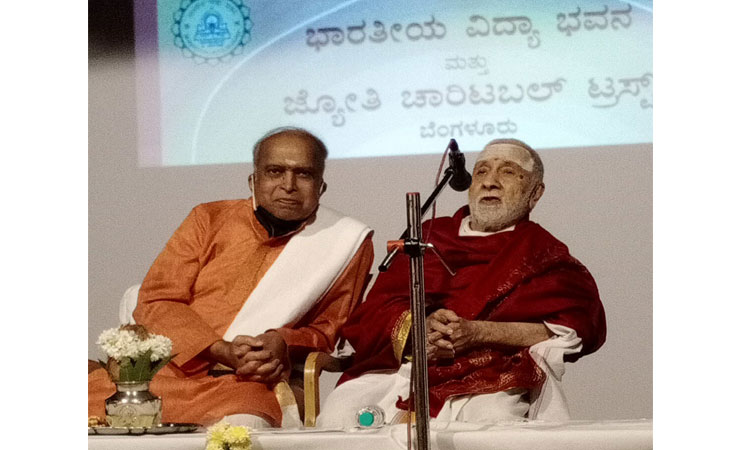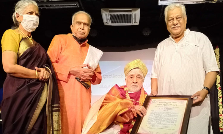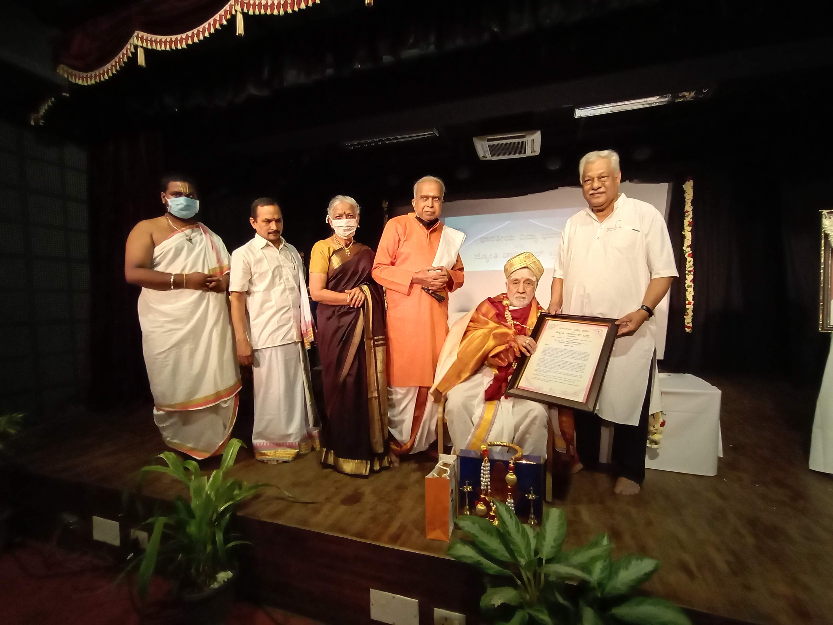 The Vyasa Jyothi Award for the year 2021 was conferred upon Veda|| Brahma || Shri Dhali Lakshmi Narasimha Bhatt, renowned Sanskrit scholar and teacher. Born in the year 1927, Shri. Dhali Lakshmi Narasimha Bhatt acquired his education from his father in the Gurukul system. He is the 47th member of his family who has dedicated his life to the study of Sanskrit and the sacred texts. Together with his Gurukul system, he has also taught at the Sringeri Sankara Mutt, Poorna Pragna Vidya Peetha, Magadi Karanikara Veda Dharma Paathashaala in Bengaluru and at the ripe age of 94, still teaches at the Yogeshwara Paathashala.